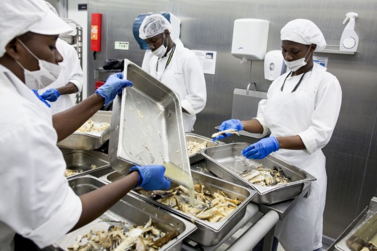 O segundo bloco de três meses é passado em formação em contexto de trabalho. Na cozinha industrial do GJM, mas também pode ser nas lojas propriamente ditas, com outras tarefas. “Não é certo que as pessoas fiquem a trabalhar, mas do primeiro grupo de 15, que começou a formação teórica em Novembro e a prática em Março, seis foram contratados” pela Jerónimo Martins, outros três foram trabalhar para outros locais, e outro transitou para o segundo grupo por questões de saúde.